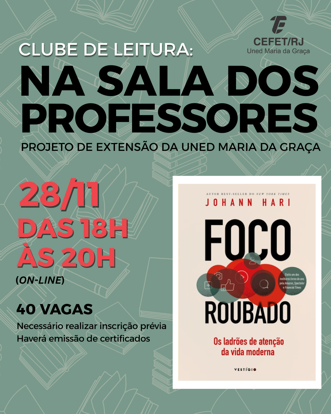 O projeto de extensão “Clube de leitura: na sala dos professores”, da Uned Maria da Graça, vai realizar seu segundo encontro para debater o livro Foco roubado: os ladrões de atenção da vida moderna, de Johann Hari. A atividade acontece no dia 28 de novembro, das 18h às 20h, de forma on-line, e é direcionada a professores e estudantes de licenciatura que desejam desenvolver o hábito da leitura e a capacidade de comunicação. Serão disponibilizadas 40 vagas e os participantes terão direito a certificado.