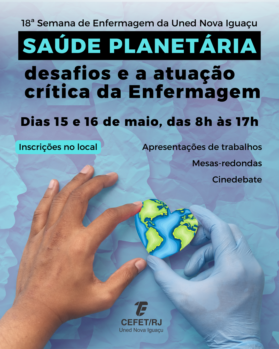 O Cefet/RJ Uned Nova Iguaçu realizará, nos dias 15 e 16 de maio, a 18ª Semana de Enfermagem, que abordará o tema “Saúde planetária: desafios e a atuação crítica da Enfermagem”, proposto pela 84ª Semana Brasileira de Enfermagem (SBEn). A programação começa às 8h e vai até as 17h e contará com apresentações de projetos de docentes e discentes, mesas-redondas e participação de profissionais convidados, com o intuito de instigar reflexões sobre as práticas e os impactos da enfermagem no cenário global da saúde.