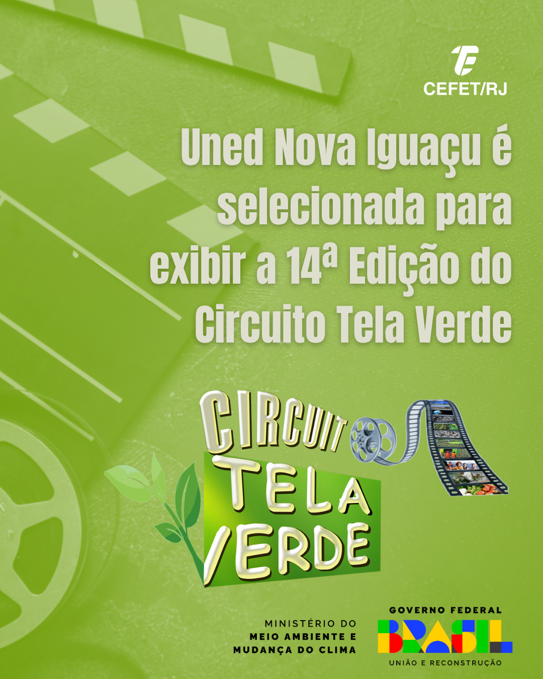 O Ministério do Meio Ambiente e Mudança do Clima (MMA) selecionou a Uned Nova Iguaçu para ser um dos 615 espaços exibidores da 14ª edição do Circuito Tela Verde (CTV14). A mostra busca divulgar e estimular atividades de educação ambiental por meio da produção audiovisual independente e atender a demanda de espaços educadores por materiais pedagógicos multimídias. As exibições ocorrerão no período de julho de 2025 a março de 2026, ainda sem programação definida. As atividades serão dirigidas ao público interno do Cefet/RJ e aos demais interessados.