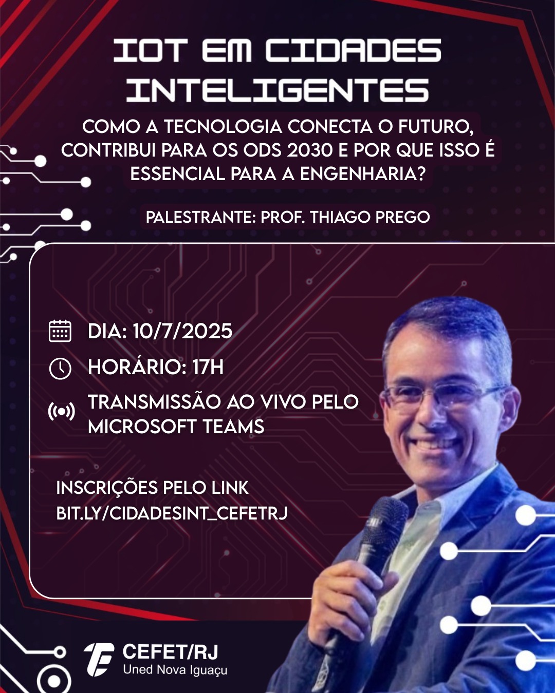 Nesta quinta-feira (10), o Cefet/RJ Uned Nova Iguaçu promoverá a palestra “Internet das Coisas (IoT) em cidades inteligentes”, com o professor Thiago Prego. A inscrição é gratuita, por meio do formulário disponível no link bit.ly/cidadesint_cefetrj. O evento terá início às 17h e será transmitido ao vivo pela plataforma Microsoft Teams. Clique aqui para acessar.