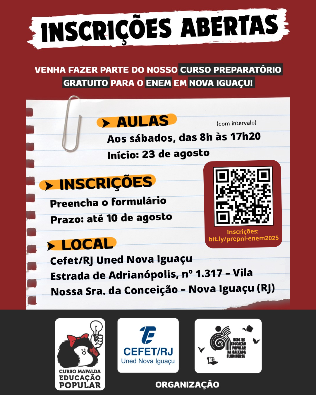 A iniciativa faz parte do projeto de extensão “Preparatório para o Enem 2025”, do Cefet/RJ Uned Nova Iguaçu, coordenado pelos professores Paulo Roberto Junior e Fábio Campos. O curso é realizado em parceria com o Curso Mafalda Educação Popular e com a Rede Educação Popular da Baixada Fluminense. Em 2025, as provas do Enem estão marcadas para os dias 9 e 16 de novembro.