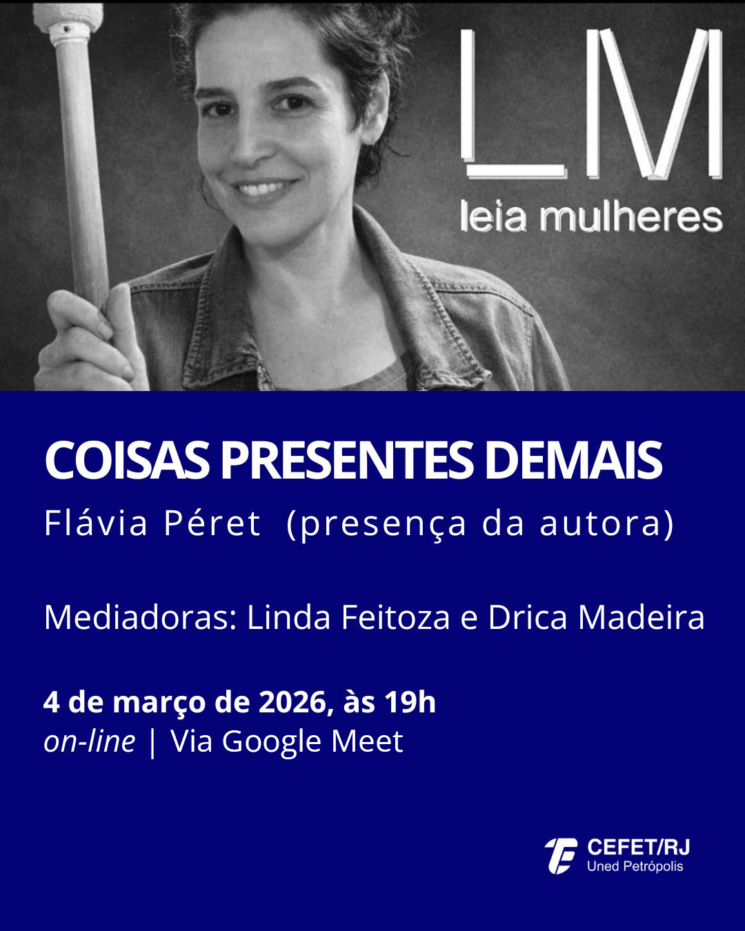 O evento, que contará com a mediação de Linda Feitoza e Drica Madeira, será on-line, a partir das 19h, pelo Google Meet. Os interessados em participar devem solicitar o link do evento por meio das redes sociais – Leia Mulheres Petrópolis no Instagram e grupo Leia Mulheres Petrópolis-RJ no Facebook.