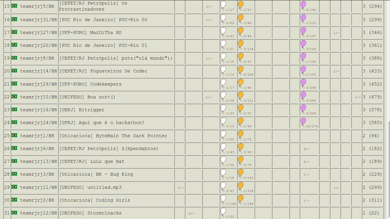No dia 15 de setembro, aconteceu a 1ª fase da Maratona de Programação da Sociedade Brasileira de Computação. Trata-se de uma competição em que trios de alunos de graduação e de pós-graduação buscam solucionar problemas propostos usando conhecimentos de programação e algoritmos. A maratona é o principal evento do gênero do país, contando perenemente com a participação das principais instituições de ensino superior do Brasil.