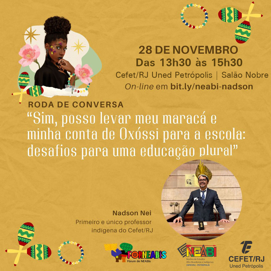 O Núcleo de Estudos Afro-brasileiros e Indígenas do Cefet/RJ Uned Petrópolis (NEABI) promove, no próximo dia 28 de novembro, a roda de conversa “Sim, posso levar meu maracá e minha conta de Oxóssi para a escola: desafios para uma educação plural”.
