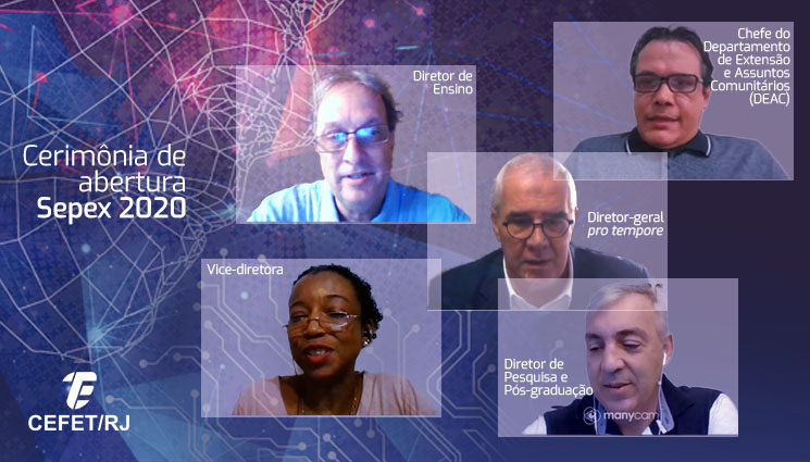 Em cerimônia on-line que ocorreu hoje (23), foi realizada a abertura oficial da Semana de Ensino, Pesquisa e Extensão (Sepex) 2020 do Cefet/RJ. Participaram da abertura do evento o diretor-geral pro tempore Antônio Maurício Castanheira das Neves, a vice-diretora Silvia Cristina Rufino, o diretor de Ensino Francisco Madureira de Avila Pires, a diretora de Extensão Sônia Regina Mendes dos Santos, o diretor de Pesquisa e Pós-graduação Wladmir Henriques Motta e o chefe do Departamento de Extensão e Assuntos Comunitários (DEAC), André Alexandre Guimarães Couto. O cerimonial foi conduzido pela servidora Simone Regina de Oliveira Ribeiro.