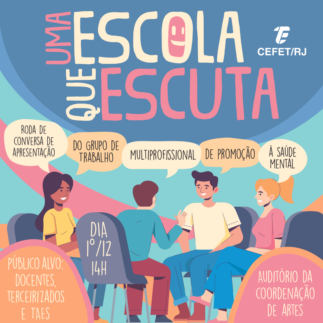 Na próxima sexta-feira (1º), o Grupo de Trabalho Multiprofissional de Promoção à Saúde Mental do Cefet/RJ irá realizar uma roda de conversa de apresentação. O evento ocorrerá no Auditório da Coordenação de Artes, na Unidade Maracanã, e é voltado a docentes, servidores técnico-administrativos em educação (TAEs) e funcionários terceirizados.