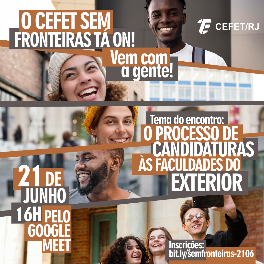 Com o objetivo de compartilhar informações sobre o processo de candidatura a faculdades no exterior, o projeto de extensão CEFET Sem Fronteiras, da Unidade Maracanã, irá realizar a palestra "O CEFET Sem Fronteiras tá ON! Vem com a gente!". O evento acontecerá no dia 21 de junho, às 16h, pela plataforma Google Meet. Os interessados devem ser escrever pelo link bit.ly/semfronteiras-2106. Os participantes terão direito a certificado.