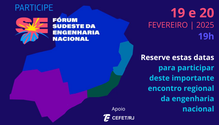 Com palestras realizadas por representantes do Rio de Janeiro, de São Paulo, de Minas Gerais e do Espírito Santo, o Fórum Sudeste da Engenharia Nacional acontecerá nos dias 19 e 20 de fevereiro, de forma on-line. Com o apoio do Cefet/RJ e de outras instituições da região, o evento tem a proposta de debater o futuro da Engenharia.