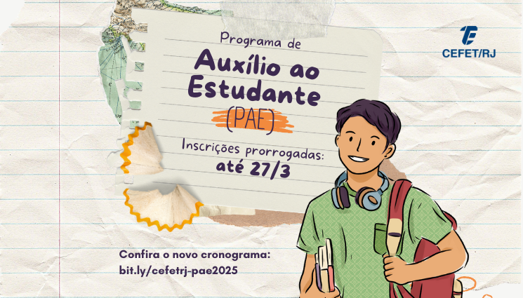 A Diretoria de Extensão (DIREX), por meio do Departamento de Extensão e Assuntos Comunitários (DEAC), informa que as inscrições para o Programa de Auxílio ao Estudante (PAE) foram prorrogadas até a próxima quinta-feira (27/3). Os interessados devem se candidatar à oportunidade pelo site assistenciaestudantil.cefet-rj.br. Estudantes contemplados em anos anteriores e que queiram participar do processo seletivo em 2025 deverão realizar novas inscrições. Não há renovação automática de auxílios.
