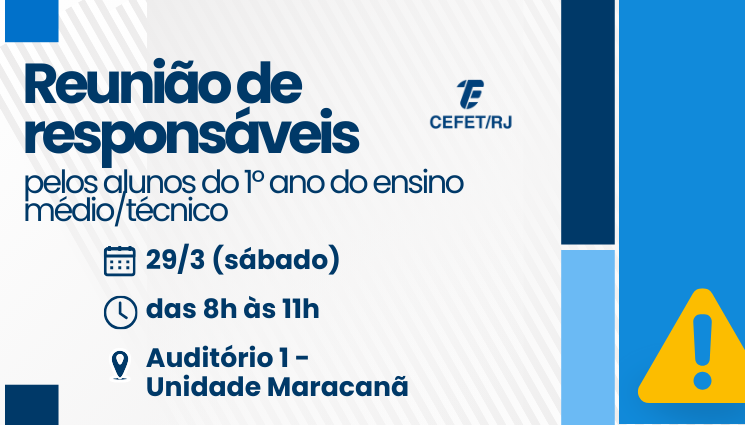 Com o objetivo de apresentar a instituição e os cursos oferecidos, o Departamento de Ensino Médio e Técnico (DEMET) do Cefet/RJ realizará a reunião de responsáveis pelos alunos do 1º ano do ensino médio/técnico da Unidade Maracanã. O encontro acontecerá no próximo sábado, das 8h às 11h, no Auditório 1.