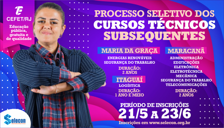 Estão abertas as inscrições para o processo seletivo dos cursos técnicos subsequentes do Cefet/RJ, com ingresso no segundo semestre de 2025. O período de inscrições vai de 21 de maio a 23 de junho. Candidatos podem solicitar isenção da taxa de inscrição, no valor de R$ 45, até 26 de maio. Clique aqui para acessar a página do processo seletivo.