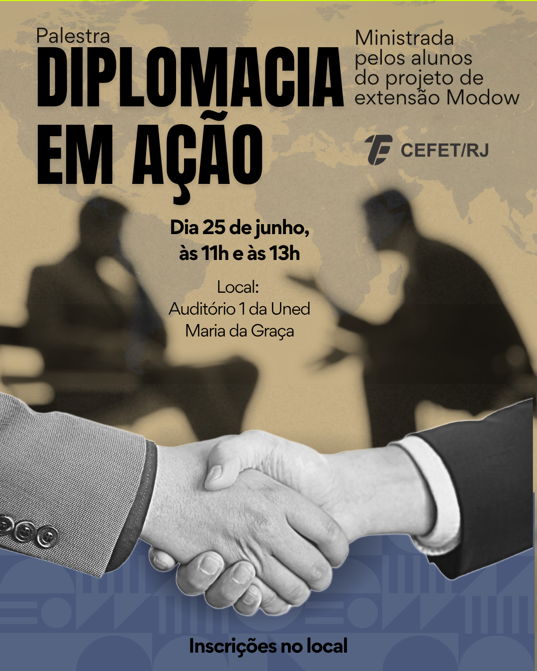 No dia 25 de junho, o Cefet/RJ Uned Maria da Graça irá sediar a palestra “Diplomacia em Ação”, com a participação de alunos voluntários do projeto de extensão Modow, um modelo diplomático que visa simular conferências nos moldes das reuniões da ONU. O evento será no Auditório 1 e ocorrerá em dois horários, às 11h e às 13h. O público-alvo são estudantes do ensino médio e as inscrições serão feitas no local.