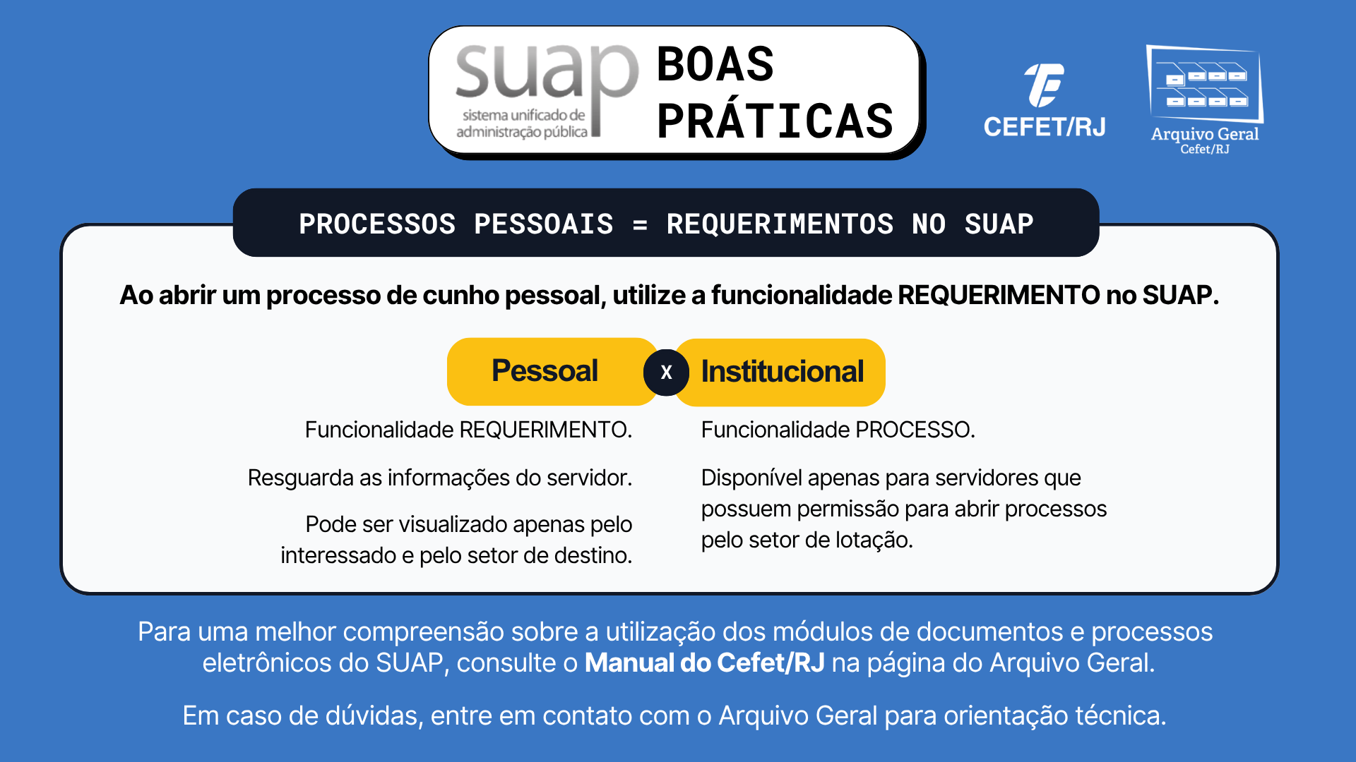 Com o intuito de esclarecer dúvidas comuns sobre algumas funcionalidades do Sistema Unificado de Administração Pública (SUAP), promover a otimização do uso do sistema e a produção adequada de documentos e processos, o Arquivo Geral divulga a campanha “Boas práticas no SUAP”.