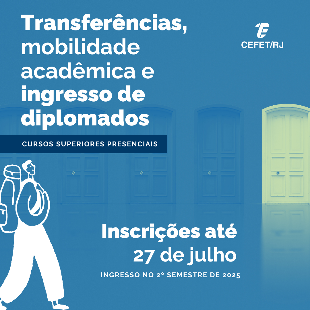 Mobilidade acadêmica interna – Seleção voltada para estudantes dos cursos de graduação do Cefet/RJ interessados em frequentar até duas disciplinas de bacharelado, licenciatura ou curso superior de tecnologia da instituição, na modalidade presencial, no primeiro período de 2025.