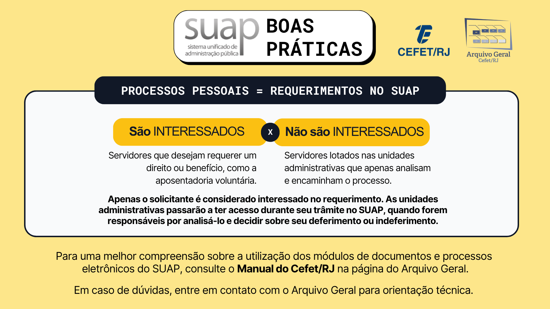 Dando continuidade à campanha “Boas práticas no SUAP”, o Arquivo Geral orienta os servidores sobre a abertura de processos pessoais, que é realizada por meio da funcionalidade “Requerimento”. Ao abrir um processo pessoal, o interessado é o solicitante que está requerendo um direito, benefício etc.