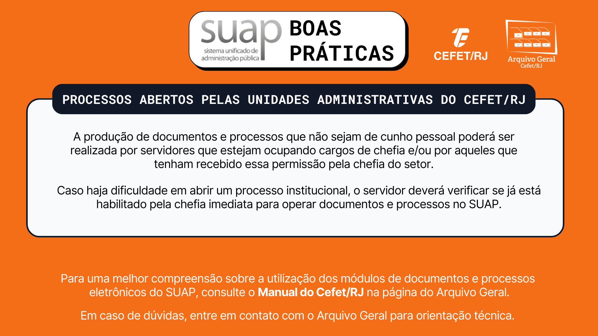 A campanha “Boas práticas no SUAP”, desenvolvida pelo Arquivo Geral (ARQG), tem o intuito de esclarecer dúvidas comuns sobre algumas funcionalidades do Sistema Unificado de Administração Pública (SUAP), promover a otimização do uso do sistema e a produção adequada de documentos e processos.