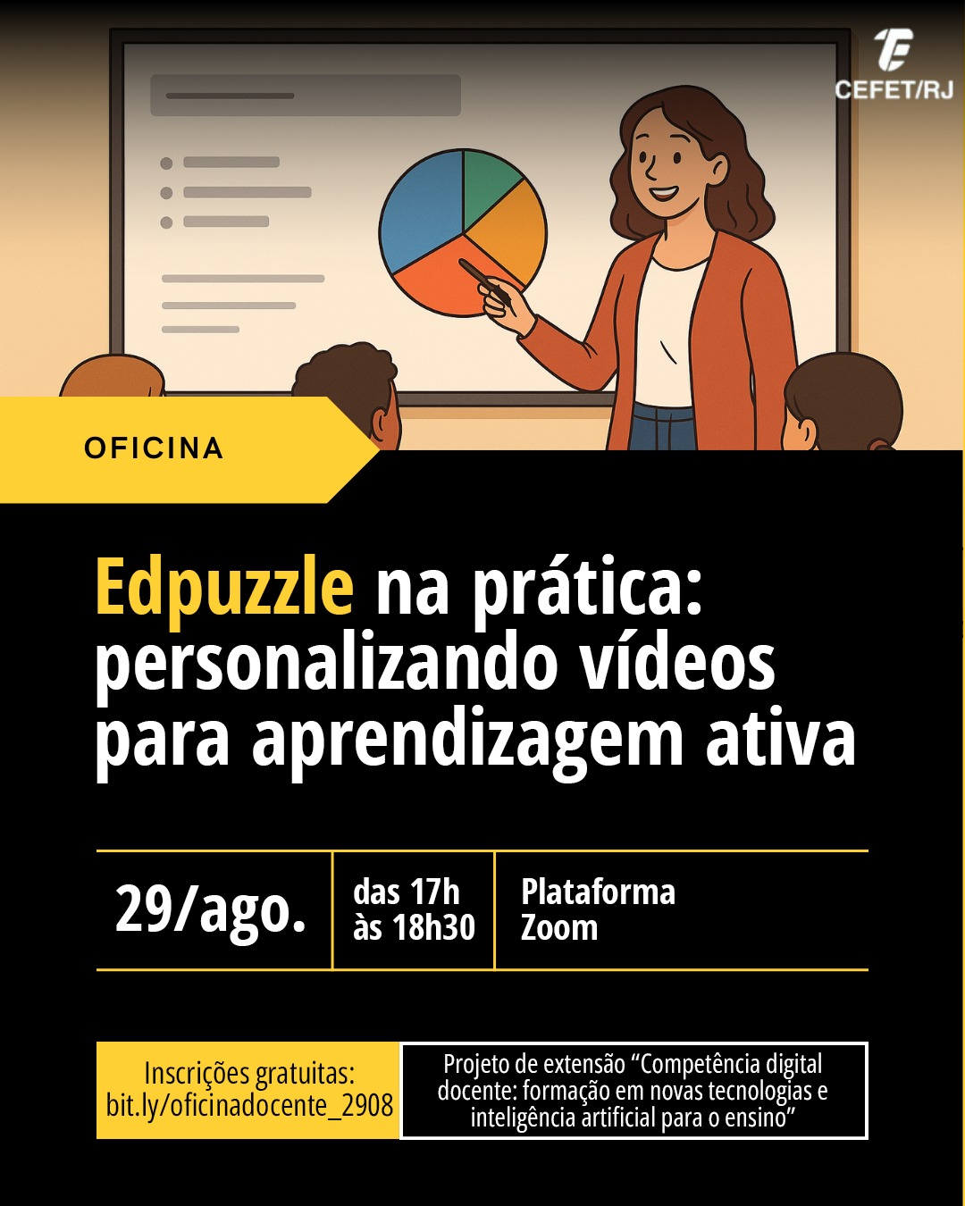Na próxima sexta-feira (29), o projeto de extensão “Competência digital docente: formação em novas tecnologias e inteligência artificial para o ensino”, da Unidade Maracanã, vai realizar a oficina gratuita “Edpuzzle na prática: personalizando vídeos para aprendizagem ativa”. A oficina é aberta a docentes do Cefet/RJ e de outras instituições e será on-line, das 17h às 18h30, pela plataforma Zoom. Os interessados devem se inscrever pelo link bit.ly/oficinadocente_2908. O endereço de transmissão será enviado aos inscritos na manhã do dia do evento.