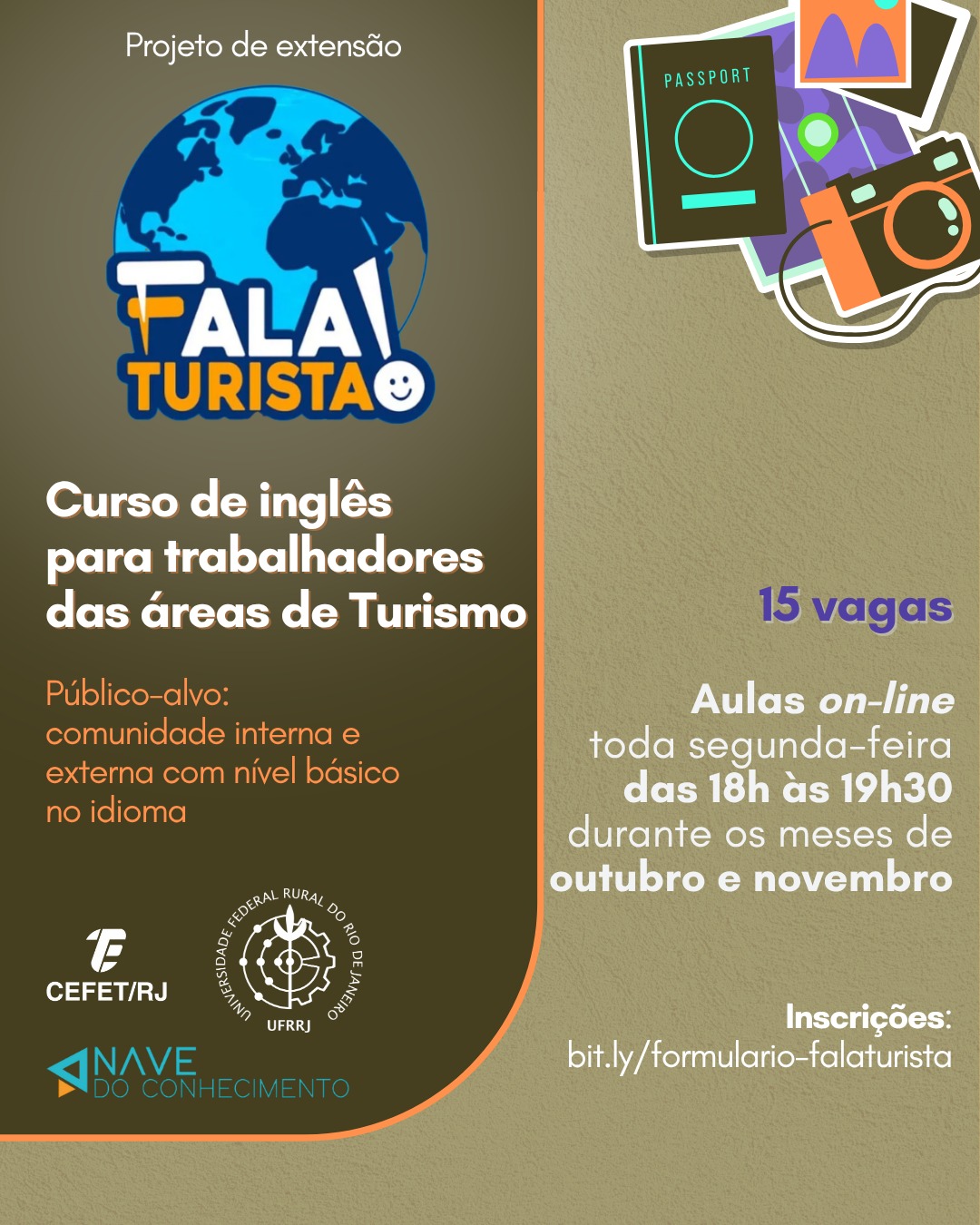 Estão abertas as inscrições para o projeto “Fala Turista!”, que oferece curso gratuito de inglês para trabalhadores das áreas de Turismo. O curso é voltado às comunidades interna e externa do Cefet/RJ, com nível básico do idioma. A oferta é de 15 vagas, com formação de lista de espera. Caso haja desistência ou três faltas consecutivas, os alunos da lista de espera serão convocados.