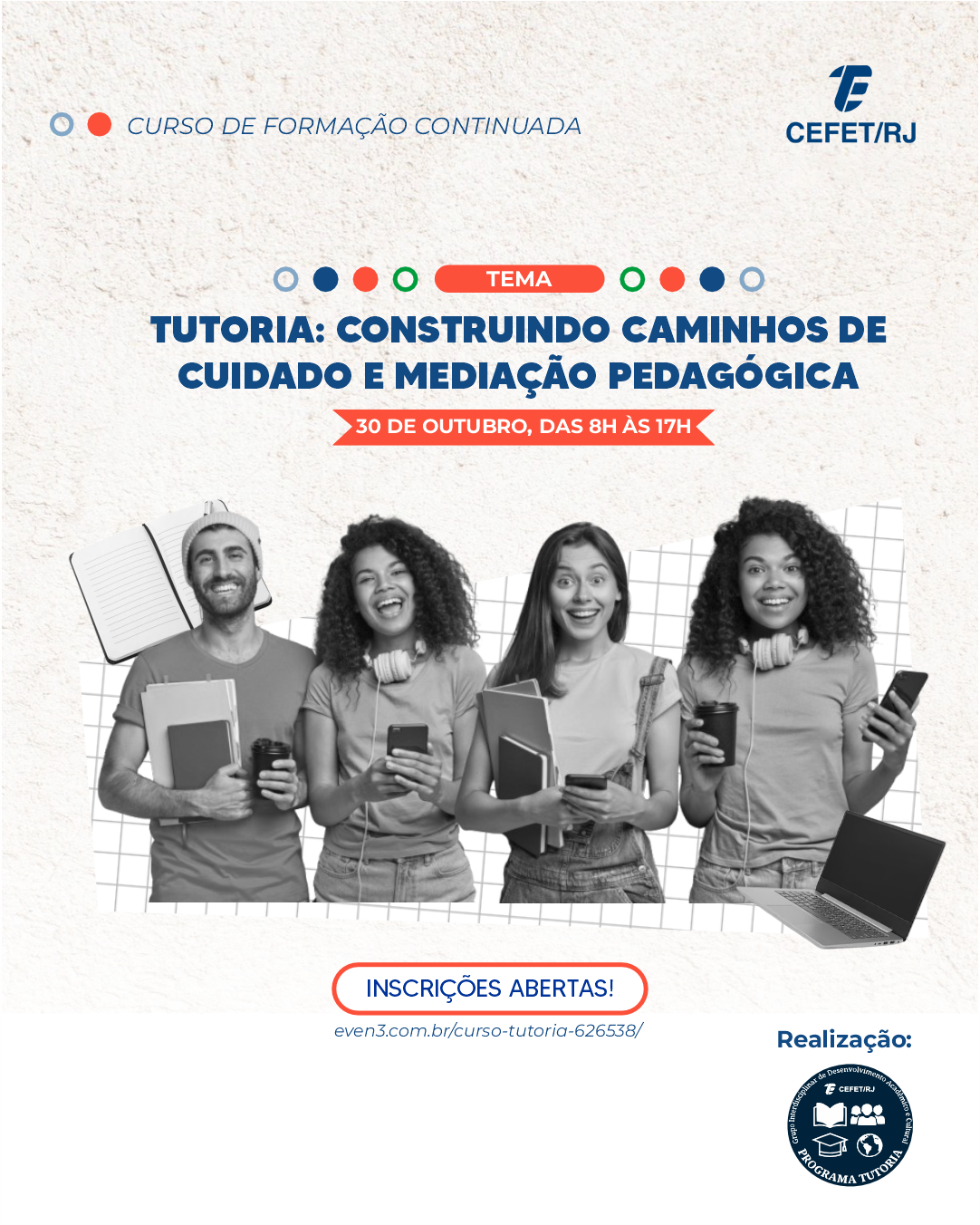 O Grupo Interdisciplinar de Desenvolvimento Acadêmico e Cultural (GIDAC) do Cefet/RJ promove, no dia 30 de outubro, o curso de formação continuada “Tutoria: construindo caminhos de cuidado e mediação pedagógica”. O evento gratuito e com emissão de certificado é voltado para docentes, técnico-administrativos e discentes de graduação. Será realizado das 8h às 17h, no Auditório 2 da Unidade Maracanã, e tem carga horária de oito horas. Clique aqui e confira a programação.