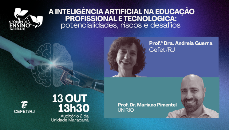 Com o tema “A inteligência artificial na educação profissional e tecnológica: potencialidades, riscos e desafios”, o X Fórum de Ensino do Cefet/RJ vai promover uma roda de conversa com a participação da professora Andreia Guerra (Cefet/RJ) e do professor Mariano Pimentel (UNIRIO). O encontro será realizado no primeiro dia do Fórum (13/10), às 13h30, no Auditório 2, durante a Semana de Ensino, Pesquisa e Extensão (Sepex) do Cefet/RJ.
