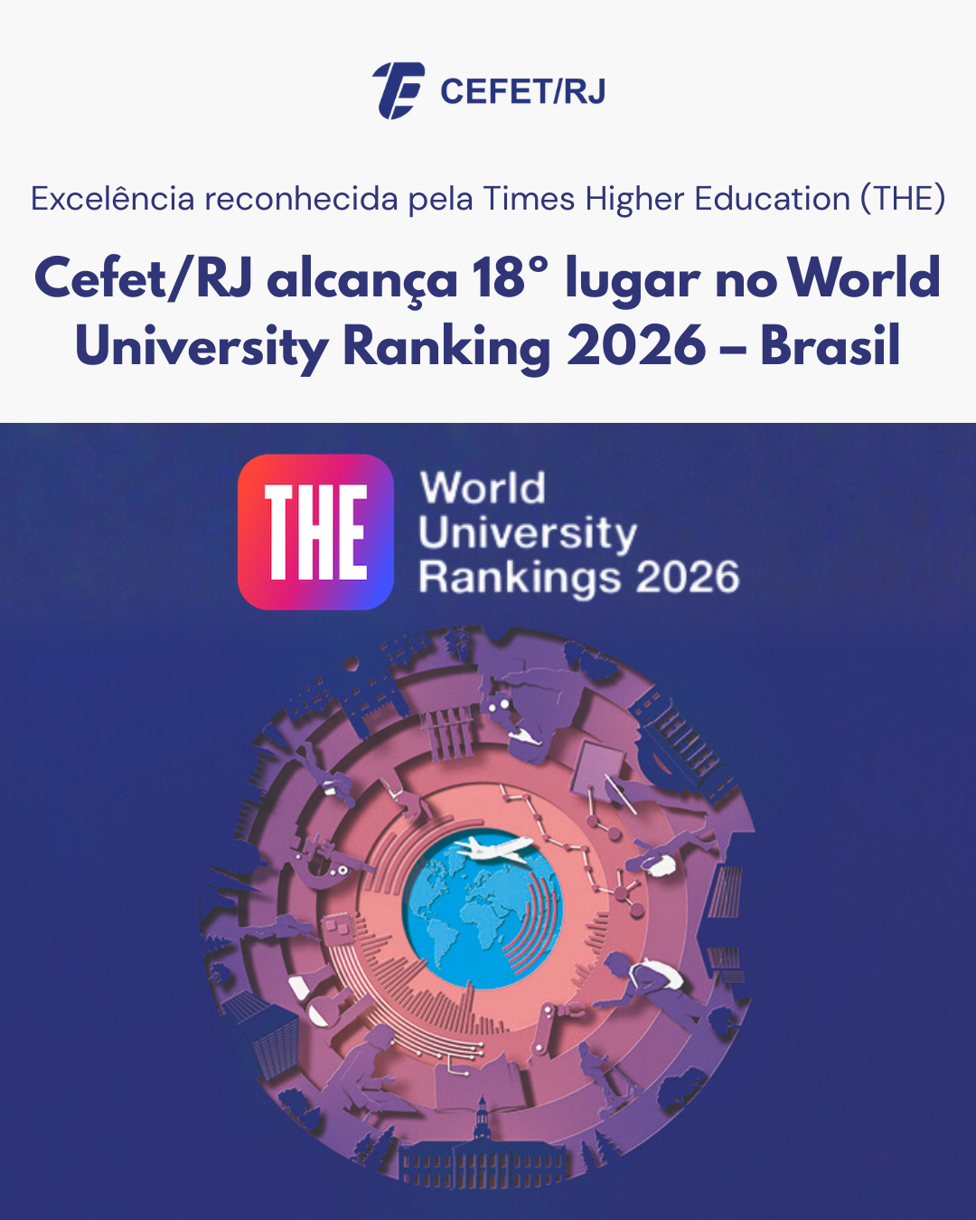 O Cefet/RJ alcançou a 18ª colocação entre as universidades brasileiras no World University Ranking 2026, divulgado pela Times Higher Education (THE). Publicada anualmente, a listagem é um dos mais reconhecidos rankings internacionais de ensino superior, reunindo nesta edição cerca de 2.100 instituições de 115 países. O Brasil teve 59 universidades brasileiras classificadas. Confira o desempenho do Cefet/RJ.
